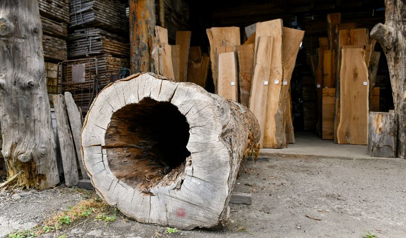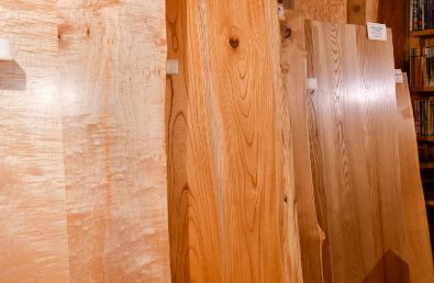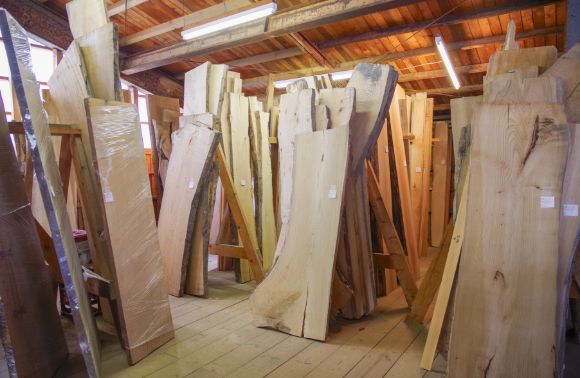 さまざまな樹種の一枚板が並ぶ板展示販売場。鈴木木材のような広葉樹専門の製材工場は、北海道内でも貴重な存在になりつつある