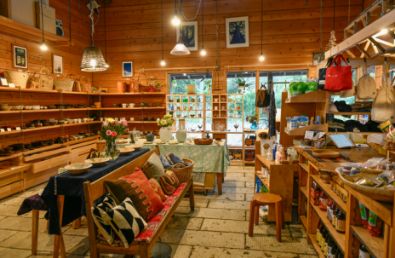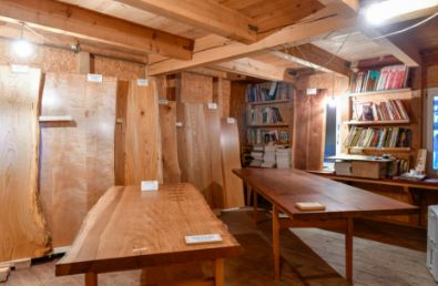 (写真右)ギャラリー杣人のオリジナルテーブルを展示する板展示販売場1階の「BOOK CAFE」
