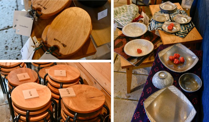 国道沿いに建つメインギャラリー兼事務所は、近所から移築した蔵を改修した建物。梁や柱には移築前から使われている古材と新しい材が入り混じり、店内は居心地の良さに包まれています。ここで販売されているのは、益子焼などの器のほか、北海道東川町を拠点とするアパレルブランドの靴下、添加物不使用の食品や調味料、そして広葉樹を座面に用いたスツール『反りっどスツール』などのオリジナルアイテムまで、愛着がわくような生活用品が集められています。