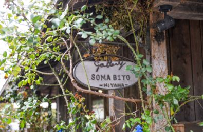 (写真右)庭の木々の中にさりげなく飾られたギャラリー杣人の看板