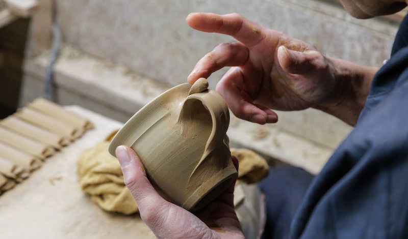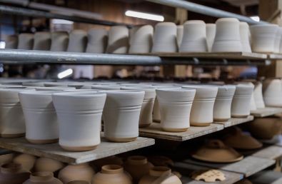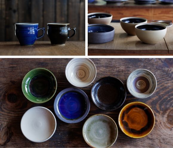 (写真右上)つくり手の温かみを感じる柔らかいフォルムと独特の厚みも、出西窯らしさ