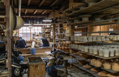 農協の米倉庫だった建物を再利用した工房。陶工ひとりに1台ずつロクロがあり、それぞれ決められた種類の器を成形から釉掛けまでを受け持っている。定休日以外は見学できる