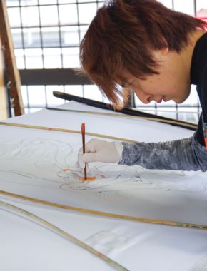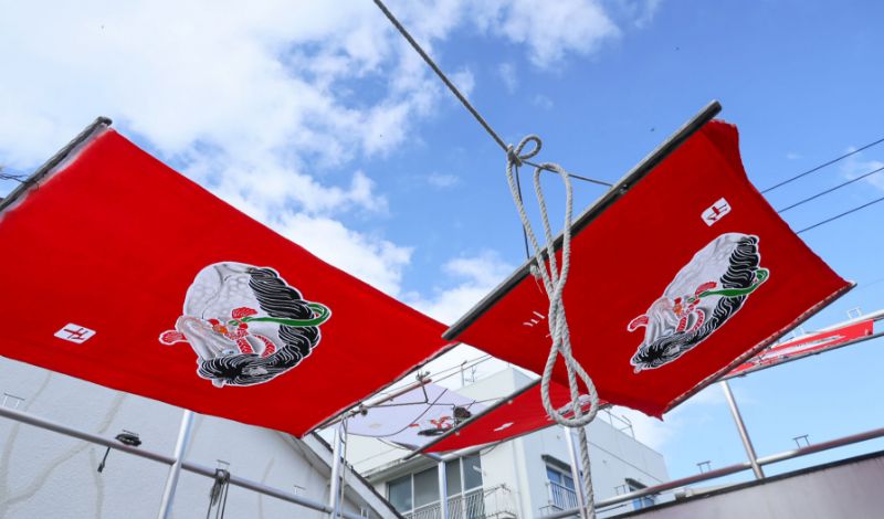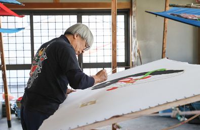 黒田旗幟店は、1904年(明治37年)の創業。現在は初代の曽祖父から4代目を数える黒田勉さん、5代目となる息子の直紘さん、勉さんの妻の寿美子さんが、染めから仕立てまですべて手作業でつくっています。黒田さんが下絵から描き、直紘さんと一緒に古くから伝わる「手描き・手染め」の技法で進めていきますが、中でも手染めでなければ表現できないのが「ぼかし」。刷毛で水を塗り、その上から色をのせる……と言葉でいうのは簡単でも、職人としては自然と力が入る作業だとか。色の濃さもその日その日で微妙に違ってきますが、見る人はそこに、人のぬくもりや愛らしさを感じるのかもしれません。
