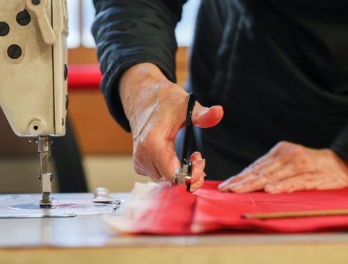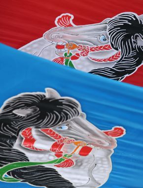 毎年、図案から考える「干支のれん」。午年の今年は、武者絵幟をモチーフにしたデザイン。干支のれんづくりは、染物屋の世界では十二支を3周してやっと一人前といわれるそうです。旗やのぼりは、1回つくれば30年は使える頑丈さを保持。黒田さんが若い頃につくったのぼりが修理のために戻ってきたというエピソードも、手作業を続けてきた老舗ならではといえます。「ずっと使ってもらえるのも嬉しいですけど、こうして来てもらって昔話をしたり『お父さん元気?』とか、『次の修理は、お互いに次の代になりますね』とか、そういうやりとりができるのがいいですね」と、黒田さんは微笑みます。