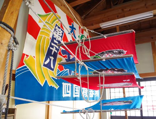内海に流れ込む黒潮に乗って豊富な栄養素が運び込まれる宇和海は、古くから豊かな漁場として地域に繁栄をもたらしました。宇和海に面する愛媛県宇和島市では、かつて多くの活魚運搬船が活躍。新しい船が完成すると、祝いの大漁旗もたくさん注文され、市内の染め屋や旗店が競うようにつくっていたといいます。以前は市内に数店の染め屋がありましたが、現在残るのは黒田旗幟店のみ。プリントを導入するなど現代の技術に移行していった店が淘汰されて、木綿の布地に手染めという昔ながらの製法を守り続けています。