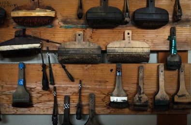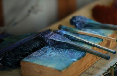 大小さまざまな刷毛を使い分けて進む旗のぼりづくり。近年は日本の刷毛職人が激減し、良質な刷毛の仕入れが難しくなりつつあるという