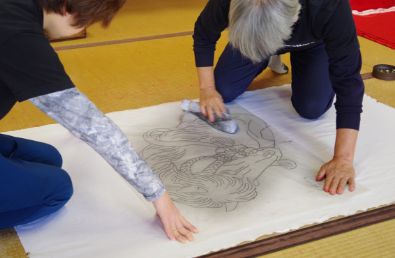 (写真左上)干支のれんの下絵作業。下絵を鉛筆書きしたトレーシングペーパーを、真っさらな木綿の布地にのせ、線に沿って針を刺し、その上から楠灰(くすばい)を入れた袋をあて、布に線画を入れていく