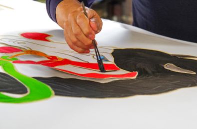 (写真右上、左下)糊で縁取り線を入れた後、刷毛で染料を塗る。最近は色の境にラインを入れないデザインが増えている