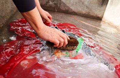 (写真右下)しっかり乾かした後、水に浸して糊を洗い落とし、天日干しして完成