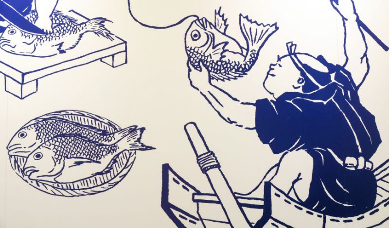 (写真右)安岡蒲鉾店が2019年(平成31年・令和元年)から毎年開催する「かまぼこ板美術展」。全国から集まった約2,000点の作品が壁いっぱいに展示されている