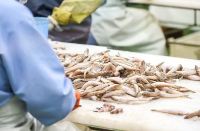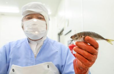 (写真左上) (写真右上)大量の魚を一匹ずつ手作業で捌くところから始まるじゃこ天づくり。スタッフさんが見せてくれたのはアジ