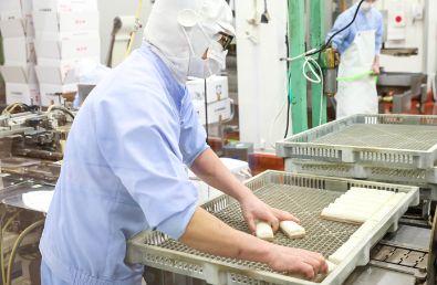 (写真左下) (写真右下)すり身を揚げるとじゃこ天に、蒸すとかまぼこになる。安岡蒲鉾店では、HACCP認定工場において原料処理から梱包までを一貫して行い、製品ごとに適した衛生管理体制のもと、安全・安心なものづくりに取り組んでいる