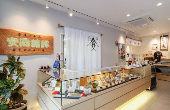 現在も約80種の魚が獲れるといわれる宇和海。南予地域では、豊かな海の幸をたっぷり使った揚げかまぼこ「じゃこ天」がソウルフードです。その始まりは宇和島藩初代藩主、伊達秀宗公が仙台から蒲鉾職人たちを連れてきたから、という説や、もともと魚介類が豊富な土地柄だったため、秀宗公が来た時には既につくられていたという説もあるほど古くまで遡り、たくさんの小さい魚(雑魚・ざこ)を原料とすることから「雑魚天」が転じて「じゃこ天」と呼ばれるようになりました。魚屋さんの店頭で熱々のじゃこ天が売られていた時代を経て、今も宇和島をはじめ南予地域の食卓には欠かせないもの。1952年(昭和27年)創業の安岡蒲鉾店も、鮮魚店として始まりました。