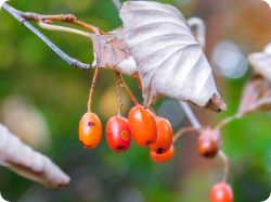 小さな赤い果実のかたまりをつけているのはナナカマドです。果実は微量の毒成分があるため、野鳥に食べられずに冬まで残りますが、凍ると毒成分は分解され真冬には野鳥の貴重な食糧になります。オレンジがかった赤い楕円形の果実を枝先にぶら下げているウラジロノキは葉の裏に細かい毛があり、白っぽく見えるのが特徴です。アオツヅラフジの果実は白い粉を帯び、まるでブドウの巨峰を小型にしたような姿ですが食べることはできません。足元のヤブコウジは濃い緑色の葉の下に赤い果実をサクランボのようにつけ、薄暗い林床でも目をひきます。