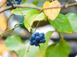 落葉性のつる植物。雌雄異株。夏に黄白色の小さな花を房状につける。果実はブドウ状につく