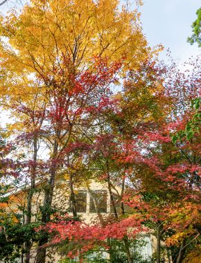 大山隠岐国立公園に指定されている中国地方最高峰の大山は、米子市方面からは美しい円すい形に見えることから「伯耆(ほうき)富士」とも呼ばれています。その大山の西麓、コナラやクヌギ、カエデなどの木々に包まれたロイヤルシティ大山リゾートは、紅葉の終盤を迎えていました。シェアサロンの周辺から歩き始めると、足元に真っ赤や黄色に染まった五角形に近い形の葉が。瓜の皮のような黒い縦縞と菱形の皮目が点在する樹皮が名前の由来になったウリハダカエデの葉です。近くには、濃い緑色の葉と鮮やかな赤い果実のコントラストが美しいソヨゴもありました。