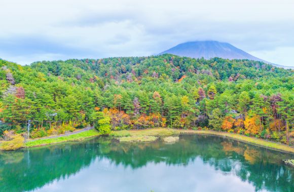 大成池を囲む森の向こうに、大山が見える