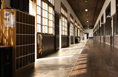 旧街道近くの高台にある宇和米博物館も、歴史を感じる建築物です。1928年(昭和3年)、開明学校の後身として建てられた旧宇和町小学校の第一校舎で、現在も第二校舎、講堂(ともに1915年・大正4年築)とともに現存。中でも、第一校舎のつくりは15の教室が横並びに連なり、柱のない木造廊下が109mも延びるという当時としてもユニークな設計。この廊下を舞台に繰り広げられる「ぞうきんがけレース」は毎回人気で、大人も子どもも上履きシューズに履き替え、レースに参戦。丁寧に磨かれた廊下は窓からの陽光を受けて、ひときわ清々しい輝きを見せています。