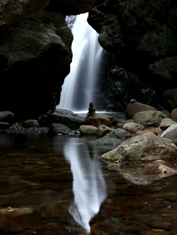 愛媛県南部の中心都市、宇和島市の市街地から車で約15分の距離に、自然豊かな薬師寺渓谷が広がっています。渓谷の中に流れるいくつかの滝の中で、遊歩道を歩いて最初に見られるのが「岩戸の滝」です。滝の手前では、両岸から迫り出す巨大な岩が滝を隠す扉のように覆いかぶさり、その向こうで美しい白色の清流が滑っています。