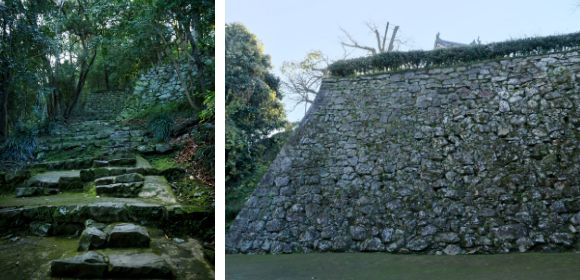 (写真左上)宇和島城へ続く、森の中の石段。火災や伐採を免れた城山のため、珍しい巨木や植物も見られる