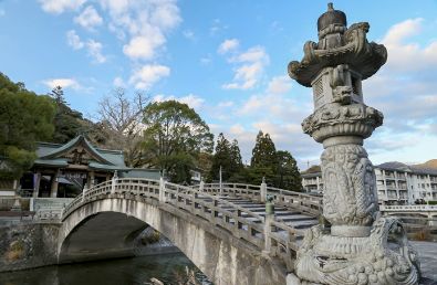(写真右)伊達家の家老、山家清兵衛(やんべせえべえ)をまつる和霊神社の境内では、太鼓橋や大鳥居が存在感を放つ