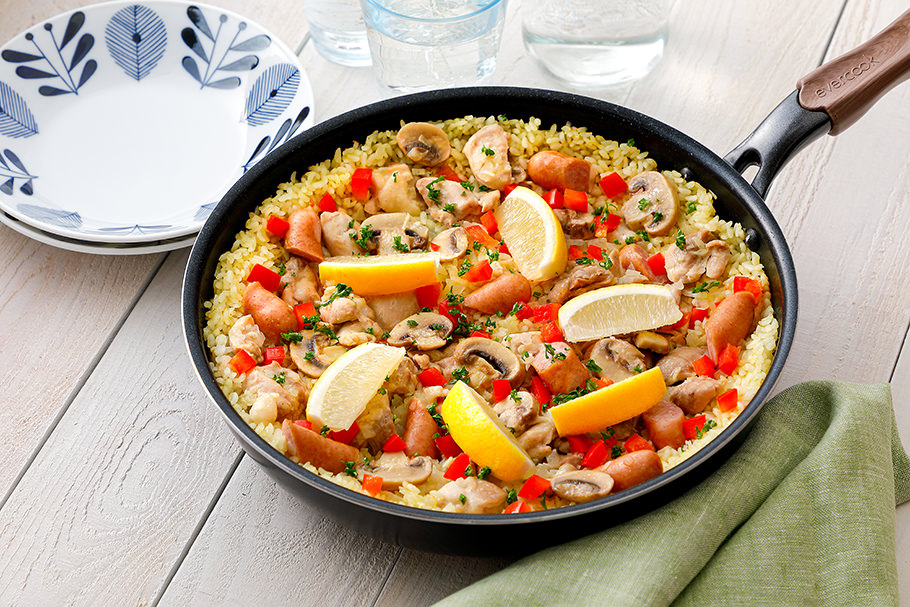 チキンやウインナーソーセージ入りで子どもが喜ぶパエリアは、フライパンごと食卓に並べればごちそう感がアップ。シーフードや旬の野菜を加えてアレンジするのもおすすめです。お子さんたちと具材選びから一緒に楽しみたいですね(柴田さん)。