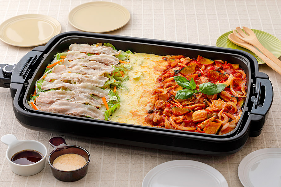 ホットプレートで2つの主菜を一度に調理するアイデアレシピ。お好みの主菜を選べるのはもちろん、両方を食べ比べたり、チーズを絡めて味変したりと、子どもから大人まで自分の好みに合わせて楽しめます(柴田さん)。