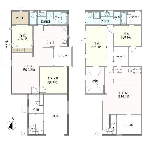 - 間取 1F:1LDK+WIC+スタジオ 2F:2LDK 建物延面積に車庫17.39平米含 ※家具・調度品等は販売価格に含まれません。