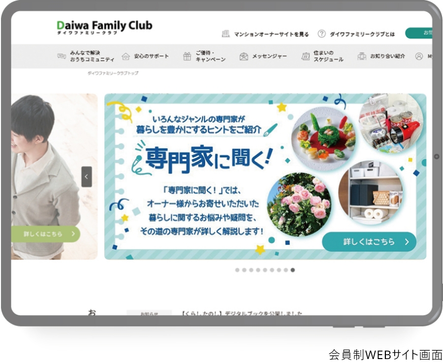 ダイワファミリークラブは、オーナーさま専用の会員制のサービスです。暮らしやビジネスに関連する各種サービスに加え、大和ハウスグループを中心としたご優待や、住まいに関する情報をご案内しています。
