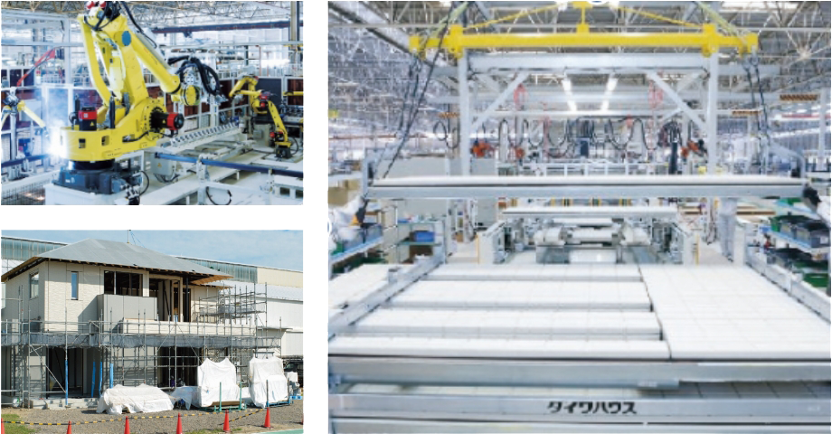 ダイワハウスでは⾃社⽣産⼯場を配置し、⼯場ではコンピュータ制御された産業⽤ロボットを導⼊した⽣産ラインを構築しています。また、⼯程ごとに専⾨の技術者を配置し、産業⽤ロボットでは担えないきめ細やかな加⼯をおこなうとともに、“⼈”の⽬による品質の確認も徹底して実施。こうした⼈と機械が協業する⽣産体制により、⾼品質で均質な⽣産を可能にしています。