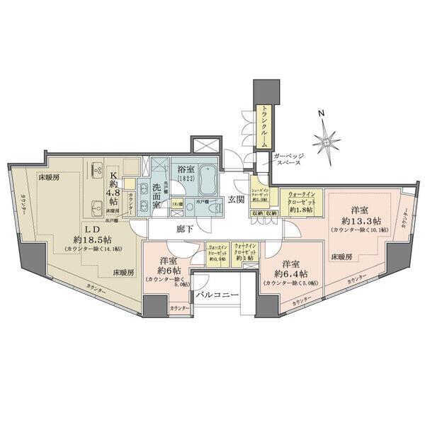 - 2024年築三菱地所レジデンスほか分譲 築後未入居物件壁芯面積にはトランクルーム面積:2.50m2、ガーベッジスペース:0.85m2を含む。