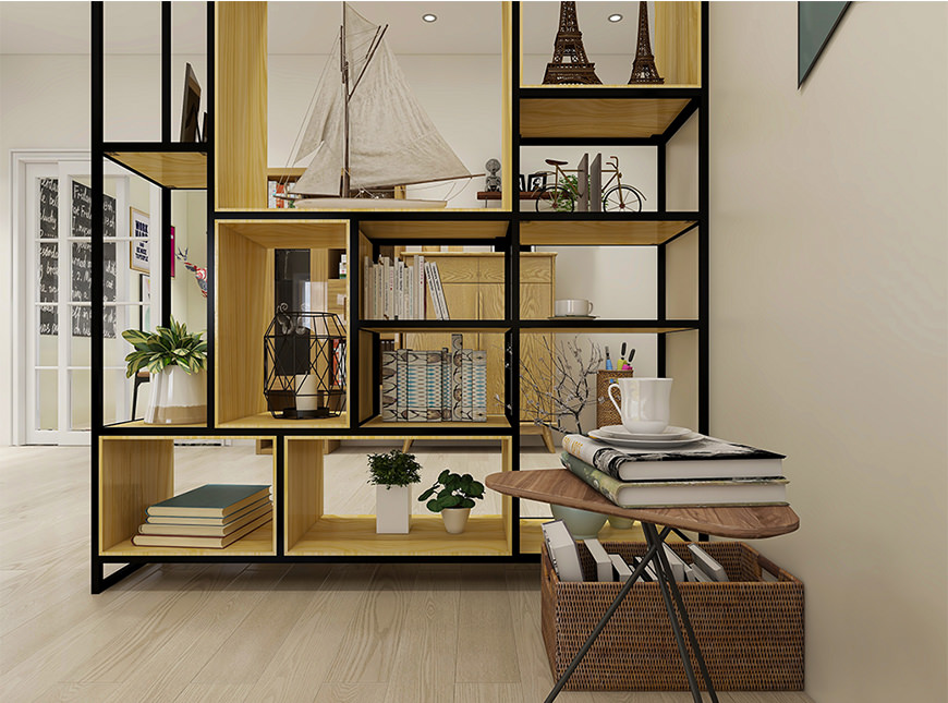 棚としての役割とともに、部屋の仕切り代わりにもなっているシェルフ