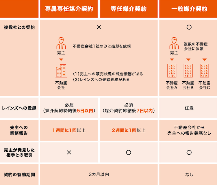 媒介契約は、(1)不動産会社との契約が1社に限られるのか (2)不動産流通機構(レインズ)に登録する義務があるのか (3)売主が自分で見つけた購入希望者と取引ができるのか…の要素で3つに分類できます。