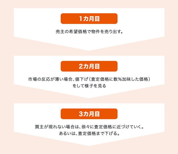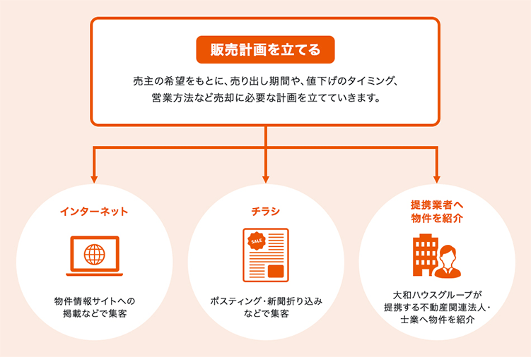 例えば、大和ハウスグループのリブネスでは、3カ月以内に不動産を売りたいという場合、「最初の1カ月目は売主の希望価格、2カ月目は査定価格に数%加味した価格、最後の3カ月目は査定価格に近い価格で売り出しましょう」というような、売主の希望やスケジュールを踏まえた綿密な販売計画を、できるだけ早い段階で打ち合わせをしてご提案しております。