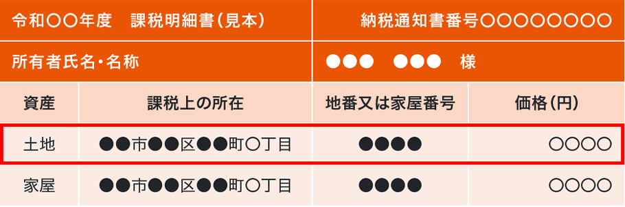 固定資産税評価額は、ご自身が所有する土地のある市区町村から発送される固定資産税の納税通知書の土地の「価格」もしくは「評価額」の欄で確認を。納税通知書の項目や様式などは自治体によって異なる。