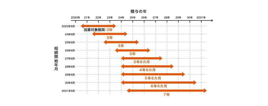 令和5年度税制改正大綱において、「生前贈与加算」の対象期間が3年から7年に延長されました。生前贈与加算とは、亡くなった人から存命中に受けた贈与(生前贈与)について、相続した人の相続税課税額に対して、死亡前7年間 さかのぼって加算する規定です。4年以上の生前贈与加算が始まるのは2027年(令和9年)1月1日以降、7年分の加算が開始されるのは2031年(令和13年)1月1日以降の相続です。