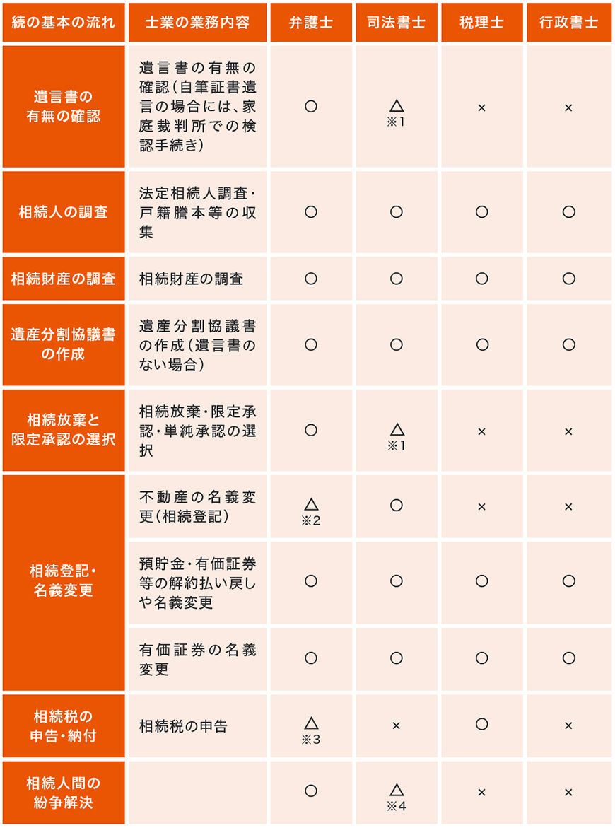 相続に関する士業の対応可能な業務内容は次の通りです。