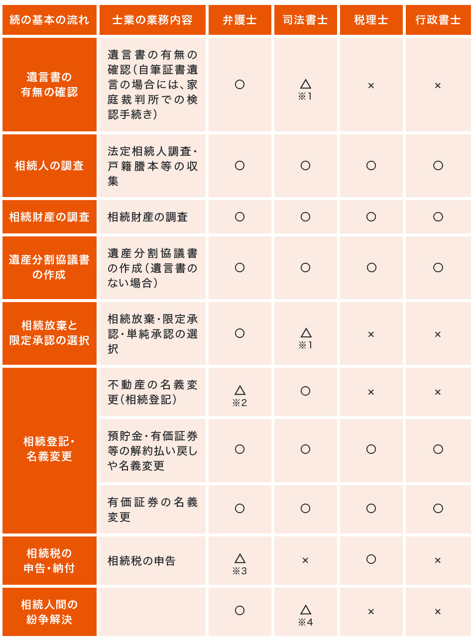相続に関する士業の対応可能な業務内容は次の通りです。