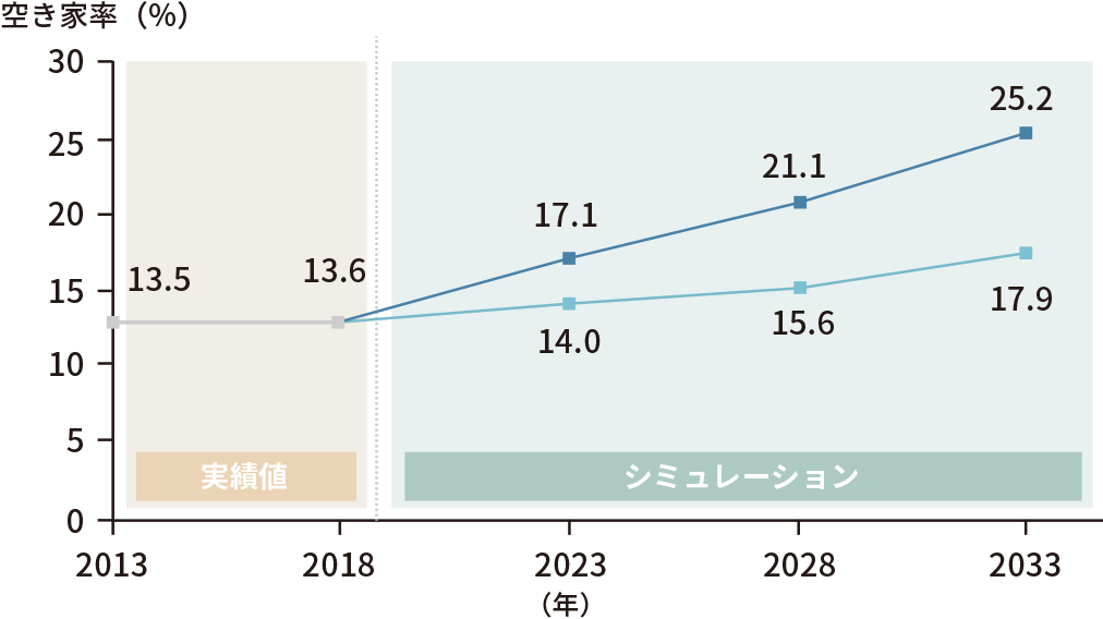 ※除却率が2008年-12年度の水準に戻る場合、2033年の空き家率は25.2%に上昇。