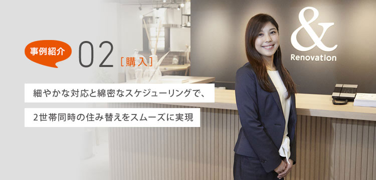 弊社の強みは、土地・建物の売却から新築・中古住宅の購入、リノベーションまで、さまざまなご依頼にワンストップで対応できる点です。今回のケースも、土地の売却は社内の専門部署が、中古マンションの購入・リノベーションは私が担当し、互いに連携をとりながら2世帯の住み替えをトータルにサポートさせていただきました。