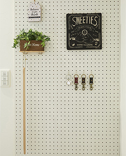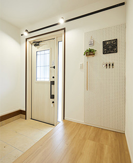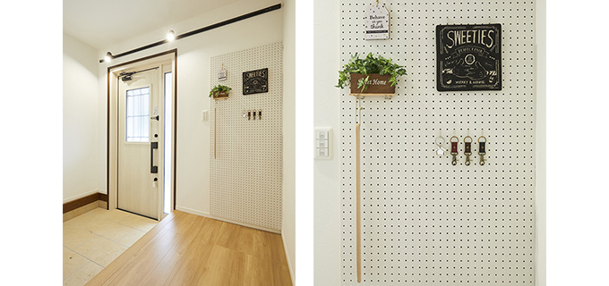 壁面に有孔化粧ボードを取り付け、鍵などの小物やお気に入りの写真などを掛けられるスペースをつくりました。照明はシーリングライトからスポットライトに変え、リノベーション前とは異なる雰囲気を演出。靴で散らかりがちな玄関をすっきりと片付けられるよう、シューズボックスの収納量も増やしました。