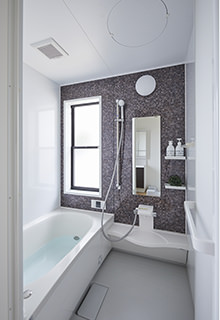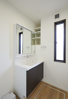 浴室・洗面室ともにリノベーション前はやや狭い印象があったため、全体的に床面積を広げています。それによってワンサイズ大きなユニットバスを導入でき、バスタイムをゆったりと過ごしていただけるようになりました。また、洗面室の壁面に設置された棚には、タオルや洗剤のストックを収納できます。