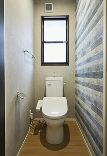 トイレは白基調の内装でしたが、床材とクロスを張り替え、ぬくもりを感じられる空間に仕上げました。