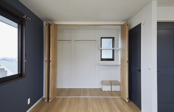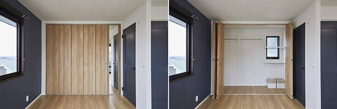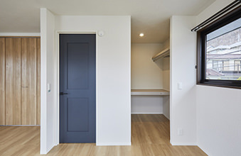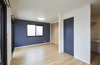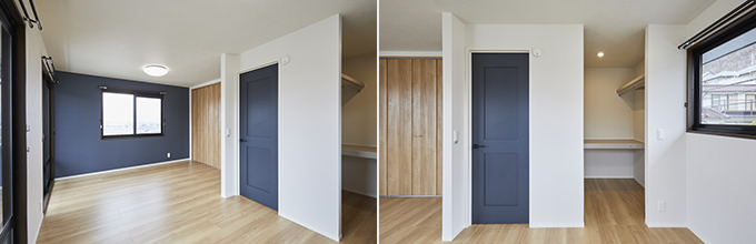 もともと洋室が2部屋ありましたが、壁をなくして1つの大きな空間に。ドアは2カ所にあるため、ライフスタイルの変化に合わせて分割することも可能です。また、収納を充実させるために設けたクローゼットとウォークインクローゼットは、季節ものの洋服や大型の荷物もすっきり片付けられるだけのスペースを確保。クローゼットの折れ戸に取り付けられた鏡は、コーディネートを考えたり身支度を整えたりするのに便利です。内装は北欧スタイルを意識し、ナチュラルな床材にブルーの建具とアクセントクロスが映える印象的な空間になっています。