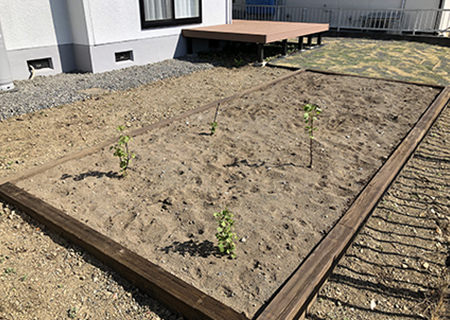 また、広い庭には枕木で囲った家庭菜園スペースをつくりました。リビングからつながるウッドデッキも設け、家族全員が集まって楽しめる場所を創出。ガーデニングをしたり、その様子をウッドデッキから眺めたりと、趣味の時間に浸れます。