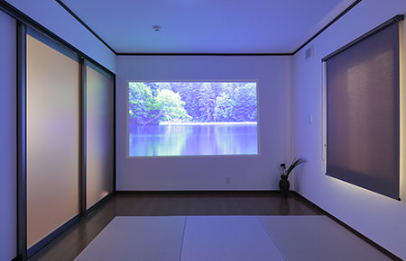 リビングに隣接した和室は、より活用しやすいスペースにしようとリニューアル。照明一体型のプロジェクターを取り付け、大迫力の映像を壁に映し出して楽しめるシアタールームを作りました。映像を映す面はもともと押し入れでしたが、壁を設けて階段下収納へと変更しています。