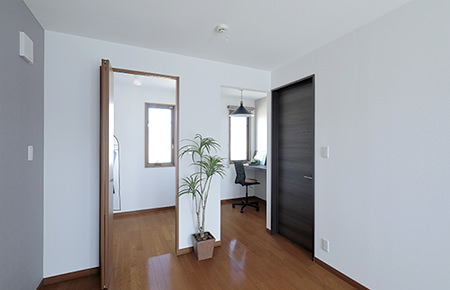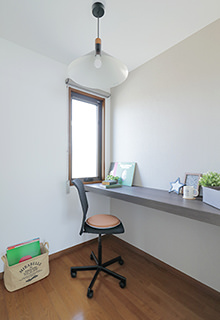 主寝室につながる書斎コーナーに造り付けのカウンターを設置し、テレワーク用のスペースに