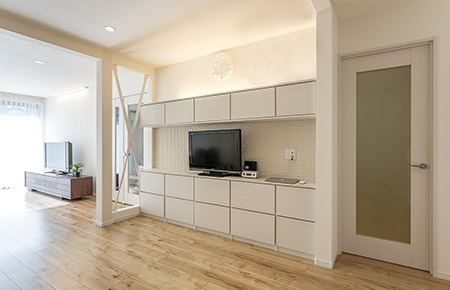 造り付け収納の壁には、調湿・脱臭効果に優れた壁材のエコカラットを使用
