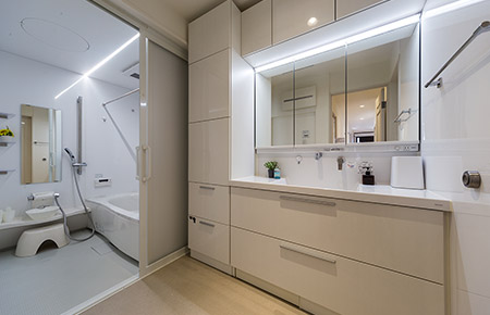 さらに、キッチンと洗面室・浴室との行き来をスムーズにすることで、家事負担を軽減しました。ご家族が増えるため、洗面室のスペースを広げて収納力を高めるなど、水まわりのレイアウトも一新しています。1階にはお母さまの居室を2室設けたほか、住まい全体としてはバリアフリーにも配慮し、極力引き戸を取り入れて段差をなくしました。