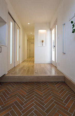 玄関のレンガ調タイルをヘリンボーン張りに。空間に独特の味わいが生まれ、おしゃれでナチュラルな雰囲気に